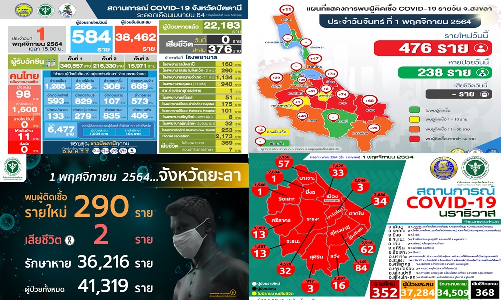 วันจันทร์ที่ 1 พ.ย.64 สถานการณ์การแพร่ระบาดของโรคติดเชื้อไวรัสโคโรนา 2019 (โควิด-19) ในพื้นที่สามจังหวัดชายแดนภาคใต้และสงขลา ตัวเลขผู้ติดเชื้อรายใหม่ในแต่ละจังหวัดยังทรงตัวขึ้นลงเล็กน้อย แต่ก็ยังติดอันดับจังหวัดที่มีจำนวนผู้ติดเชื้อมากที่สุดในประเทศ