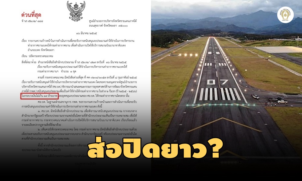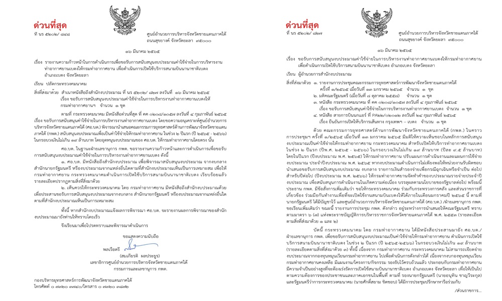 หนังสือฉบับนี้เท้าความไปยังต้นเรื่อง เมื่อวันที่ 13 ม.ค.65 คณะกรรมการยุทธศาสตร์ด้านการพัฒนาจังหวัดชายแดนภาคใต้ หรือ กพต. ได้มีมติให้ความเห็นชอบในหลักการ สนับสนุนงบประมาณเป็นค่าใช้จ่ายให้กรมท่าอากาศยาน สำหรับเปิดให้บริการสนามบินเบตงในช่วง 2 ปีแรก คือ ปี 2565 กับปี 2566 ในกรอบวงเงินไม่เกิน 19 ล้านบาท หรือปีละ 9.5 ล้านบาท