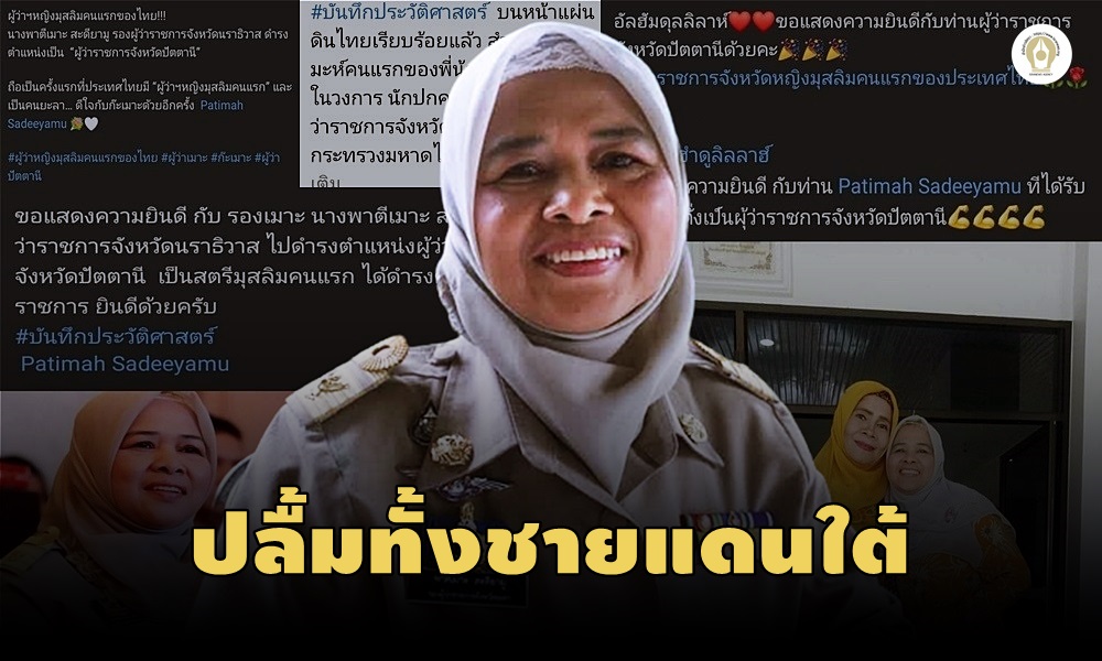 สมใจคนชายแดนใต้ “พาตีเมาะ สะดียามู” ข้าราชการฝ่ายปกครองขวัญใจคนพื้นที่ ขยับขึ้นเป็นผู้ว่าฯ ปัตตานี เผยเป็นผู้ว่าฯหญิงมุสลิมคนแรกของประเทศไทย ชาวยะลา นราธิวาส ประสานเสียง แม้ไม่ใช่ผู้ว่าฯในจังหวัดตัวเอง ก็ถือเป็นผู้ว่าฯของพวกเรา