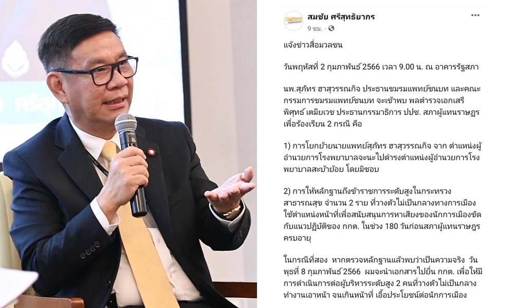 ด้าน นายสมชัย ศรีสุทธิยากร ประธานยุทธศาสตร์ขับเคลื่อนนโยบายพรรคเสรีรวมไทย และอดีตกรรมการการเลือกตั้ง ได้โพสต์ข้อความแจ้งสื่อมวลชนผ่านเฟซบุ๊กส่วนตัวว่า ในวันพฤหัสบดีที่ 2 ก.พ.66 เวลา 09.00 น. นายแพทย์สุภัทร จะเดินทางเข้าพบ พล.ต.อ.เสรีพิศุทธ์ เตมียเวส ประธานคณะกรรมาธิการป้องกันและปราบปรามการทุจริต สภาผู้แทนราษฎร หรือ กมธ.ป.ป.ช. เพื่อร้องเรียน 2 กรณี คือ