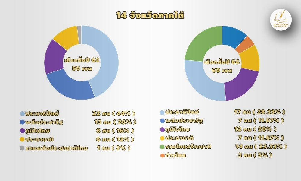 การเลือกตั้ง ส.ส.ที่เพิ่งจะผ่านพ้นไป พื้นที่ 14 จังหวัดภาคใต้มีเขตเลือกตั้งรวมทั้งหมด 60 เขต เพิ่มขึ้นจากการเลือกตั้งปี 2562 ที่มีเขตเลือกตั้งรวมเพียง 50 เขตเท่านั้น