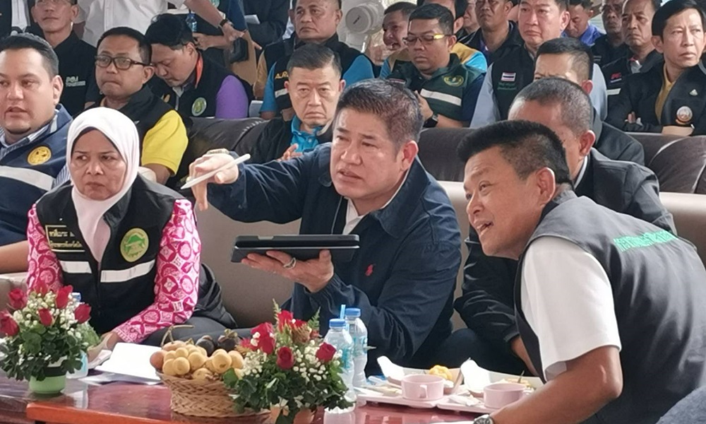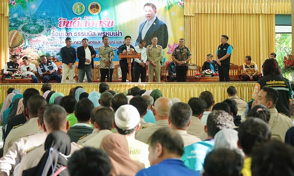 ต่อมา รมว.เกษตรฯ นำคณะทำงานลงพื้นที่พบปะกับประชาชน ที่หอประชุมที่ว่าการอำเภอธารโต จ.ยะลา เพื่อรับฟังข้อมูลสถานการณ์ด้านการเกษตรและประเด็นปัญหาในพื้นที่ จากตัวแทนเกษตรกรชาวสวนยางและสวนทุเรียน