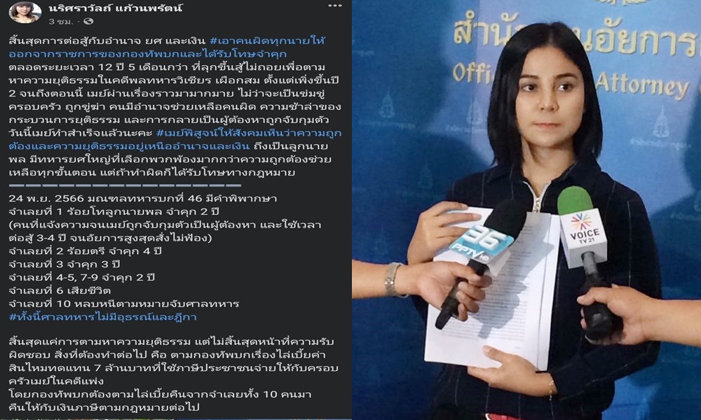 วันนี้เมย์ทำสำเร็จแล้วนะคะ เมย์พิสูจน์ให้สังคมเห็นว่า ความถูกต้องและความยุติธรรมอยู่เหนืออำนาจและเงิน ถึงเป็นลูกนายพล มีทหารยศใหญ่ที่เลือกพวกพ้องมากกว่าความถูกต้องช่วยเหลือทุกขั้นตอน แต่ถ้าทำผิดก็ได้รับโทษทางกฎหมาย