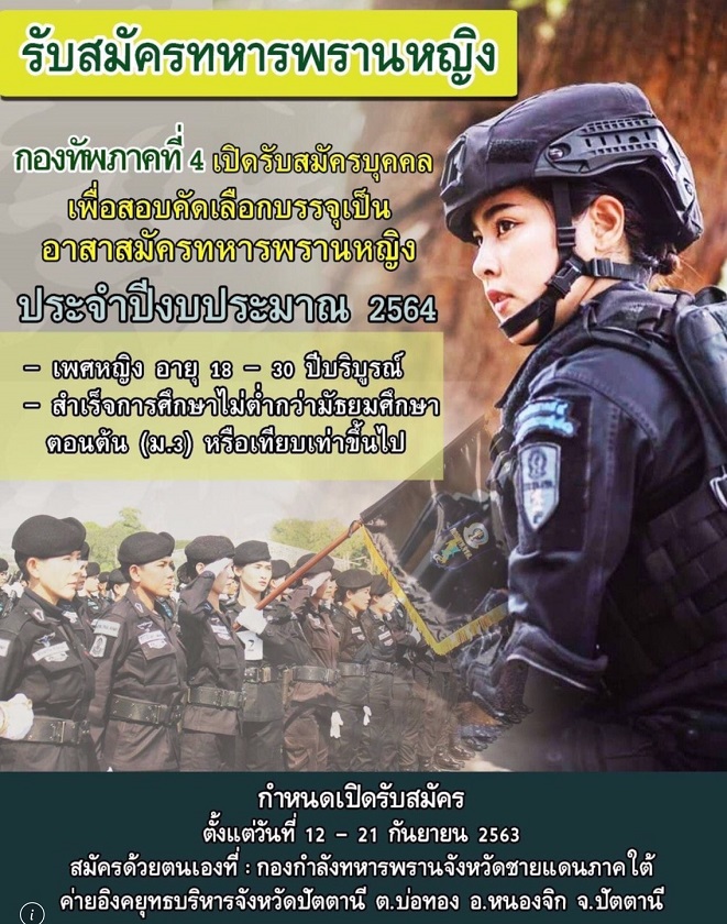 กองกำลังทหารพรานจังหวัดชายแดนภาคใต้ ได้เปิดรับสมัครบุคคลเข้าเป็น "อาสาสมัครทหารพรานหญิง" สังกัดกองทัพภาคที่ 4 ประจำปีงบประมาณ 2564 โดยเปิดให้ยื่นใบสมัครด้วยตนเองตั้งแต่วันที่ 12-21 ก.ย.63 ที่ผ่านมา จากนั้นจะมีการสอบขั้นที่ 1 ที่ค่ายอิงคยุทธบริหาร และกองพลทหารราบที่ 15 ค่ายสมเด็จพระศรีสุริโยทัย อ.หนองจิก จ.ปัตตานี ในวันศุกร์ที่ 25 ก.ย.