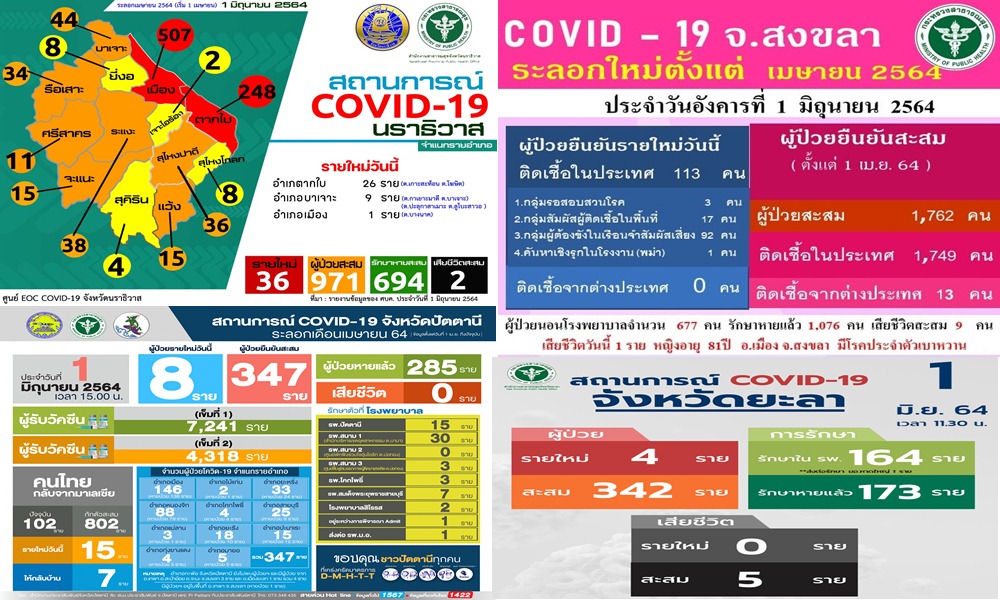ด้านรายงานสถานการณ์การแพร่ระบาดของไวรัสโควิด-19 ในพื้นที่สามจังหวัดชายแดนใต้ และ จ.สงขลา ประจำวันอังคารที่ 1 มิ.ย.64