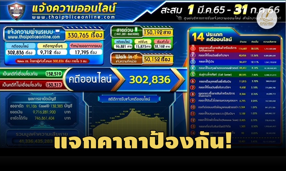 ข้อมูลของศูนย์บริหารการรับแจ้งความออนไลน์ สำนักงานตำรวจแห่งชาติ ระบุว่า นับตั้งแต่เปิดระบบรับแจ้งความออนไลน์ เมื่อวันที่ 1 มี.ค.2565 จนถึงวันที่ 31 ก.ค.2566 มีการรับแจ้งความทั้งหมด 330,764 เรื่อง โดยเป็นคดีออนไลน์ 302,836 เรื่อง มี 5 ประเภทของคดีออนไลน์ที่มีการแจ้งความมากที่สุด คือ การหลอกลวงซื้อขายสินค้า, หลอกให้โอนเงินเพื่อทำงาน, หลอกให้กู้เงิน, หลอกให้ลงทุนผ่านระบบคอมพิวเตอร์ และคดีข่มขู่ทางโทรศัพท์ หรือ Call Center