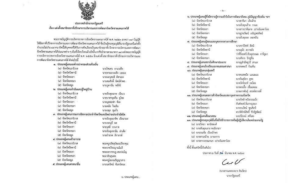 ดังนั้น อาศัยอำนาจตามมาตรา 19 แห่งพระราชบัญญัญญัติ การบริหารราชการจังหวัดชายแดนภาคใต้ พ.ศ.2553 จึงแต่งตั้งสมาชิกสภาที่ปรึกษาการบริหารและการพัฒนาจังหวัดชายแดนภาคใต้ ดังต่อไปนี้
