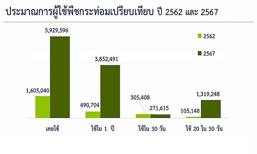 จากข้อมูลสำนักงาน ป.ป.ส. ได้มีการเปรียบเทียบตัวเลขจำนวนผู้ใช้พืชกระท่อมในปี 2562 (ก่อนมีการปลดพืชกระท่อมออกจากยาเสพติด) กับปี 2567 (หลังปลดพืชกระท่อมออกจากยาเสพติดแล้ว) พบว่า กลุ่มที่เคยใช้เดิมในปี 2562 มีเพียง 1,605,040 ราย แต่ในปี 2567 มีจำนวนเพิ่มขึ้นเป็น 5,929,596 ราย คิดเป็น 3.7 เท่าของปี 2562