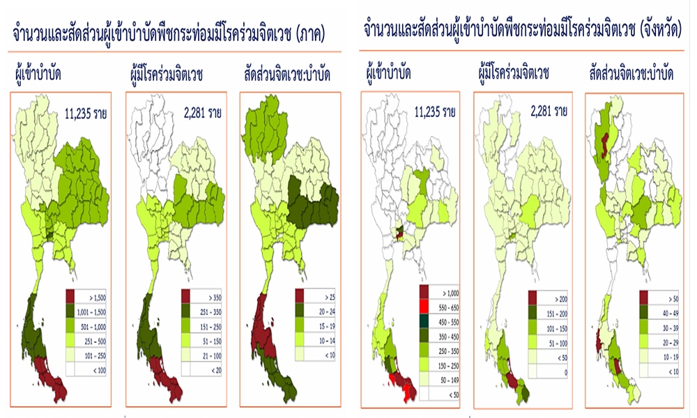 และในส่วนที่เป็นผู้เข้าบำบัดที่มีโรคร่วมจิตเวชนั้น ในภาค 9 มากที่สุด มี 1,415 ราย รองลงมาภาค 8 มี 328 ราย