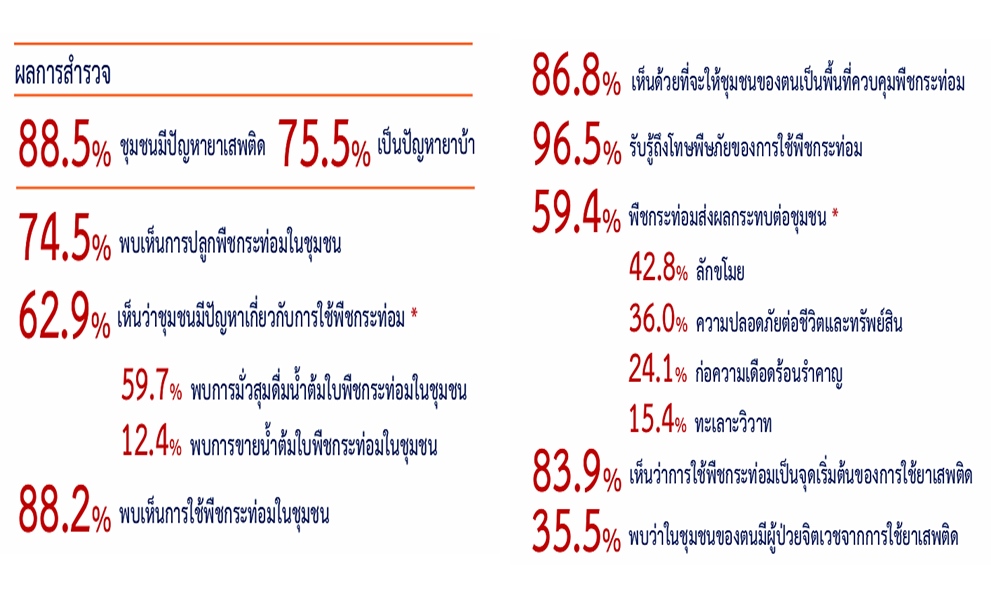 - 86.8 เปอร์เซ็นต์ เห็นด้วยที่จะให้ชุมชนของตนเป็นพื้นที่ควบคุมพืชกระท่อม