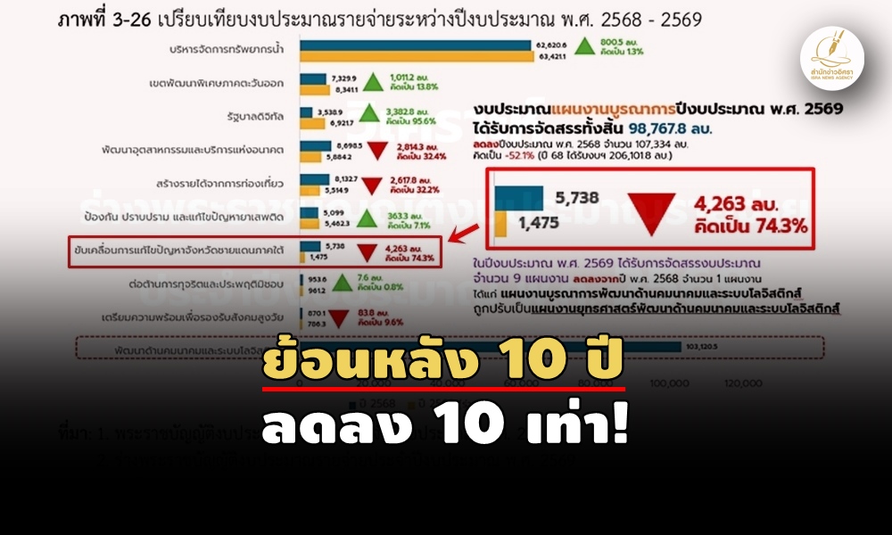 เป็นที่น่าสังเกตว่า ในร่าง พ.ร.บ.งบประมาณรายจ่ายประจำปี 2569 ที่กำลังเข้าสู่การพิจารณาของสภาผู้แทนราษฎร วาระแรก วันพุธที่ 28 พ.ค.68 นั้น “งบดับไฟใต้” หรือ “งบแผนงานบูรณาการขับเคลื่อนการแก้ไขปัญหาจังหวัดชายแดนภาคใต้” ลดลงกว่าปีก่อนหน้า คือ ปีงบประมาณ 2568 ถึง ร้อยละ 74.3