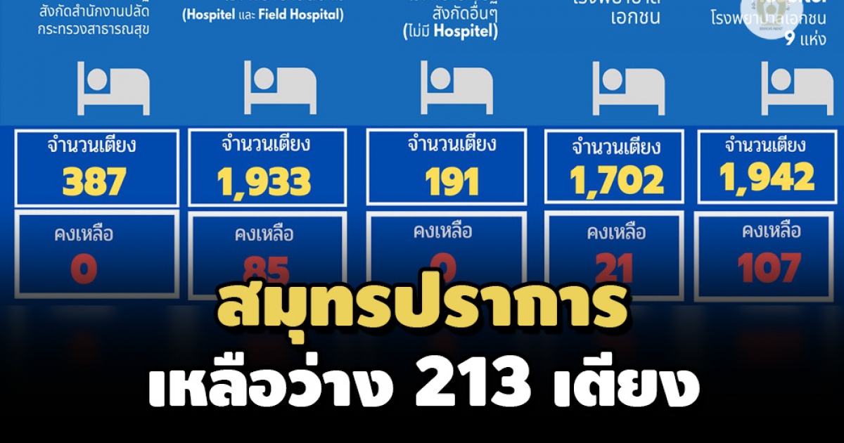 สำหรับจำนวนเตียงผู้ป่วย โรงพยาบาลรัฐสังกัดสำนักงานปลัดกระทรวงสาธารณสุข และโรงพยาบาลรัฐสังกัดอื่นๆ มีอัตราการใช้เตียงเต็มขีดความสามารถแล้ว ส่วนโรงพยาบาลสนาม (Hospitel และ Field Hospital) จำนวน 1,846 เตียง คงเหลือ 85 เตียง โรงพยาบาลเอกชน จำนวน 1,702 เตียง คงเหลือ 21 เตียง และฮอสพิเทล โรงพยาบาลเอกชน 9 แห่ง จำนวน 1,942 เตียง คงเหลือ 107 เตียง รวมเหลือเตียงว่างทั้งหมด 213 เตียง