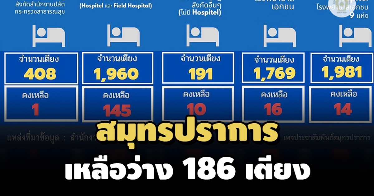 ส่วนจำนวนเตียงผู้ป่วย คงเหลือเตียงว่าง 186 เตียง แบ่งเป็น โรงพยาบาลรัฐสังกัดสำนักงานปลัดกระทรวงสาธารณสุข จำนวนเตียง 408 เตียง คงเหลือ 1 เตียง โรงพยาบาลสนาม (Hospitel และ Field Hospital) จำนวน 1,960 เตียง คงเหลือ 145 เตียง โรงพยาบาลรัฐสังกัดอื่นๆ (ไม่มี Hospitel) จำนวน 191 เตียง คงเหลือ 10 เตียง โรงพยาบาลเอกชน จำนวน 1,769 เตียง คงเหลือ 16 เตียง ฮอสพิเทล โรงพยาบาลเอกชน 9 แห่ง จำนวน 1,981เตียง คงเหลือ 14 เตียง