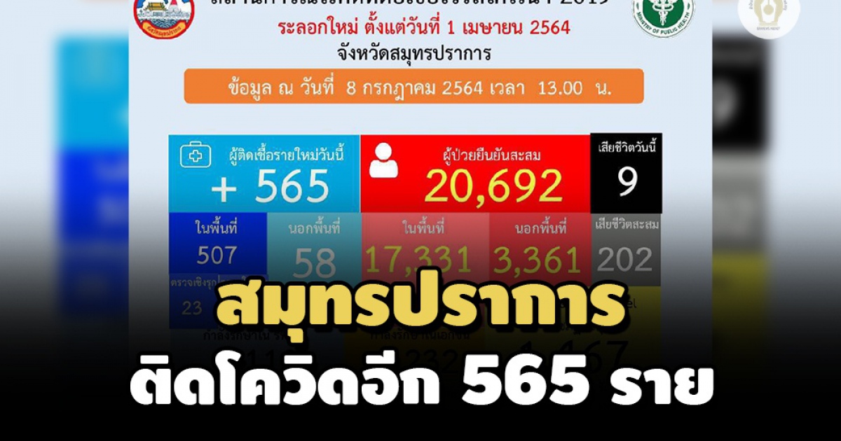จังหวัดสมุทรปราการ พบผู้ติดเชื้อรายใหม่ 565 ราย รวมสะสม 20,692 ราย อยู่ระหว่างการรักษาใน รพ. 3,809 ราย เหลือว่าง 256 เตียง เสียชีวิตอีก 9 ราย ทำให้มียอดรวมผู้เสียชีวิตอยู่ที่ 202 ราย