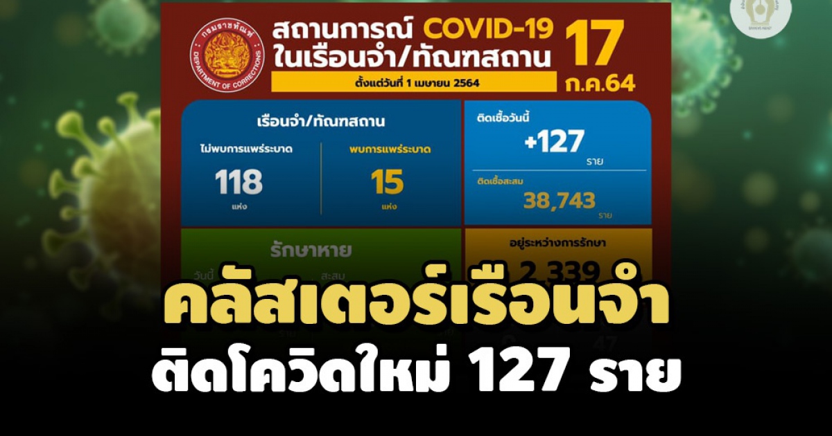 วันนี้สถานะเรือนจำสีแดงและสีขาว มีการเปลี่ยนแปลง 1 แห่ง คือ เรือนจำกลางอุบลราชธานีที่พบผู้ต้องขังแดนในติดเชื้อ ส่งผลให้เรือนจำสีแดงที่พบการแพร่ระบาดเพิ่มเป็น 15 แห่ง และเรือนจำสีขาวที่ไม่พบการแพร่ระบาดลดเหลือ 118 แห่ง โดยผู้ติดเชื้อรายใหม่พบในเรือนจำสีแดง 115 ราย และพบในห้องแยกกักโรคผู้ต้องขังรับใหม่ 12 ราย มีผู้ป่วยที่รักษาหายสะสม 36,063 ราย หรือ 93% ของผู้ติดเชื้อสะสม 38,743 ราย สำหรับผู้ต้องขังที่ยังรักษาตัวอยู่ เป็นผู้ป่วยกลุ่มสีเขียว 74.5% สีเหลือง 24.5% และสีแดง 1% ผู้เสียชีวิตสะสม 47 ราย หรือ 0.1% ของผู้ติดเชื้อสะสม
