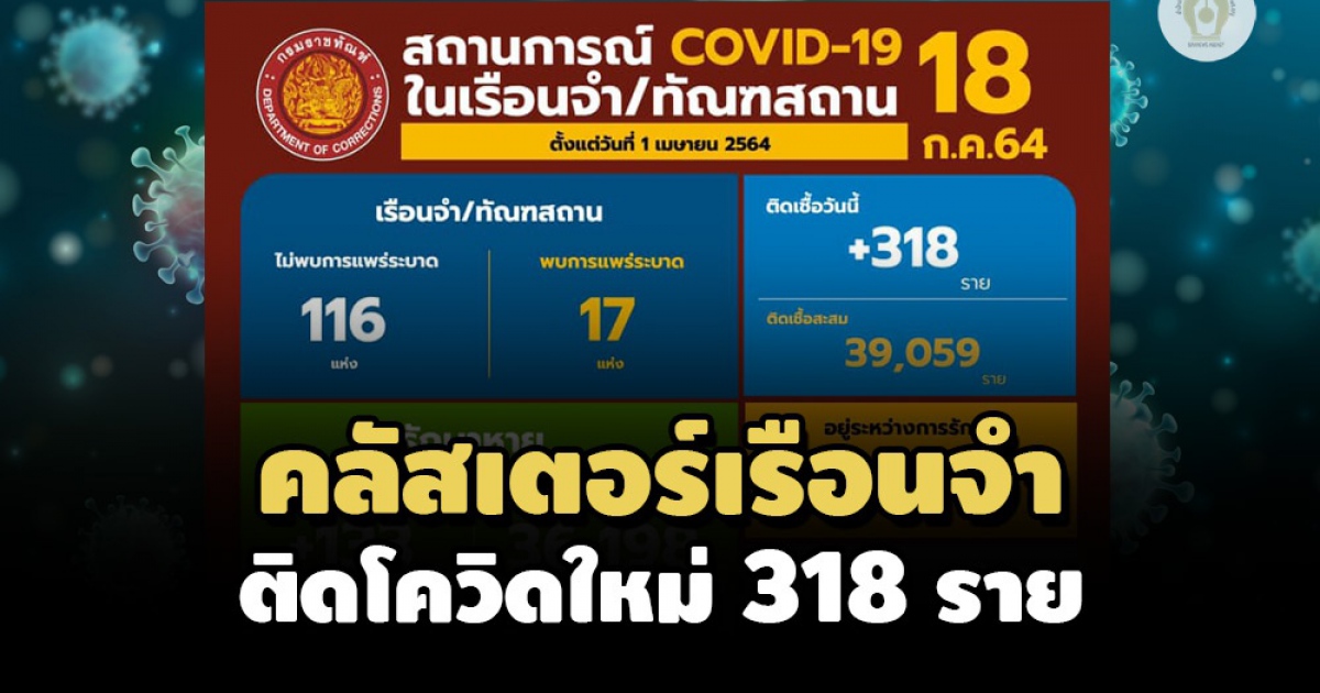 ผู้ต้องขังติดเชื้อใหม่ 318 ราย แบ่งเป็น พบในเรือนจำ 251 ราย และห้องแยกกักโรคผู้ต้องขังรับใหม่ 67 ราย หายป่วยเพิ่ม 133 ราย พบการแพร่ระบาดเพิ่มขึ้นที่เรือนจำอำเภอแม่สอด-เรือนจำจังหวัดสระบุรี กรมราชทัณฑ์เตรียมลดสถานะเรือนจำสีแดงที่ควบคุมการระบาดได้ 5 แห่ง เร็วๆ นี้