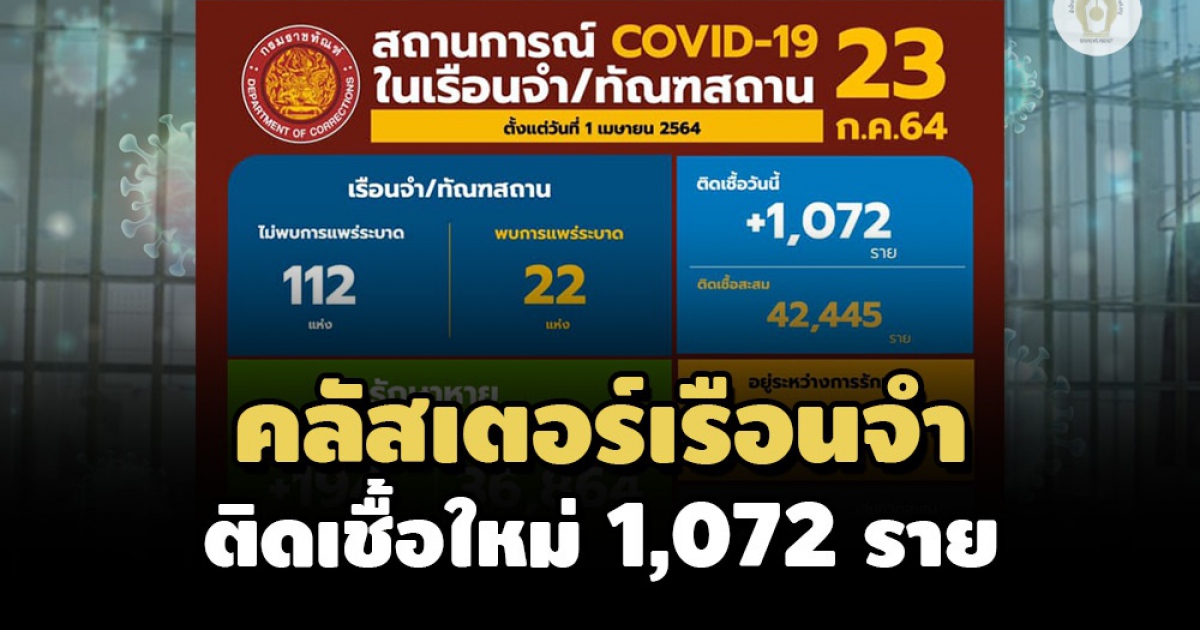 ผู้สื่อข่าวรายงานว่า เมื่อวันที่ 23 ก.ค.2564 นายอายุตม์ สินธพพันธุ์ อธิบดีกรมราชทัณฑ์ เปิดเผยถึงสถานการณ์การแพร่ระบาดของโรคติดเชื้อไวรัสโควิดในเรือนจำและทัณฑสถาน พบผู้ติดเชื้อรายใหม่ 1,072 ราย แบ่งเป็น พบในเรือนจำสีแดง 1,001 ราย และพบในห้องแยกกักโรคผู้ต้องขังรับใหม่ 71 ราย หายป่วยเพิ่ม 194 ราย รวมยังมีผู้ต้องขังติดเชื้อที่อยู่ในการดูแลของกรมราชทัณฑ์ 5,187 ราย และไม่มีรายงานผู้เสียชีวิตต่อเนื่องเป็นวันที่ 13
