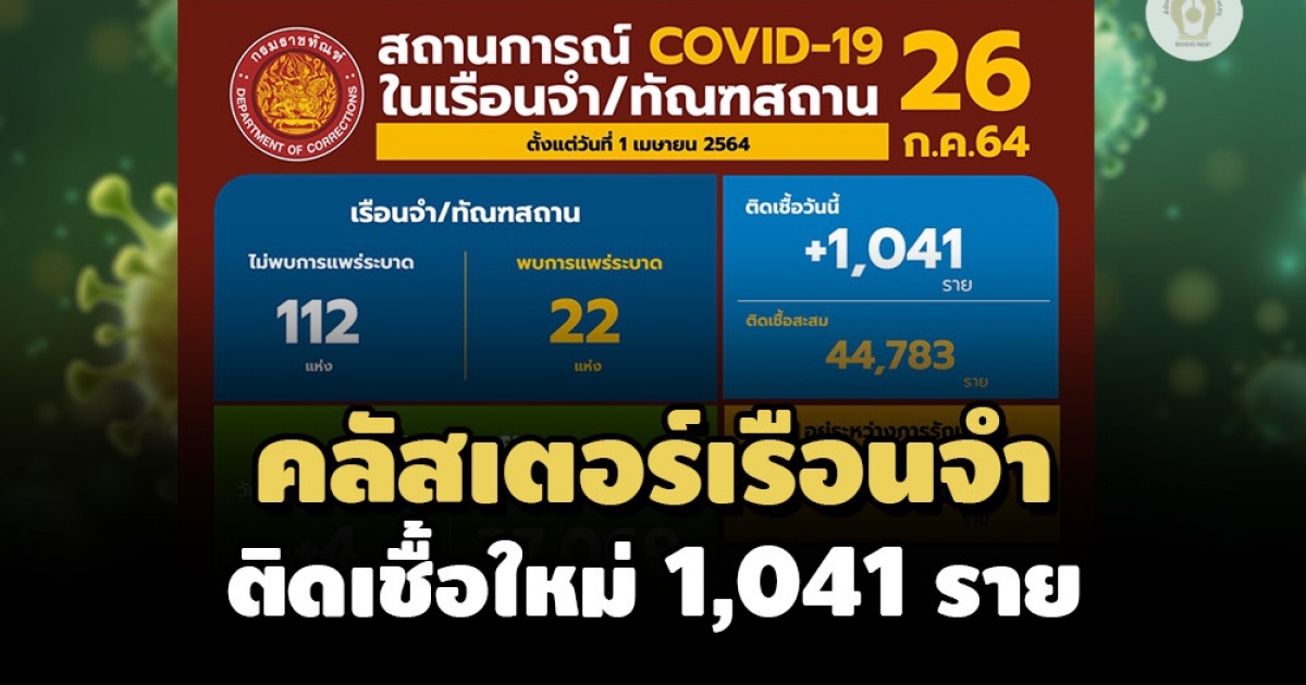 ผู้สื่อข่าวรายงานว่า เมื่อัที่ 26 ก.ค.2564 นายอายุตม์ สินธพพันธุ์ อธิบดีกรมราชทัณฑ์ เปิดเผยถึงสถานการณ์การแพร่ระบาดของโรคติดเชื้อไวรัสโควิดในเรือนจำและทัณฑสถาน พบผู้ติดเชื้อรายใหม่ 1,041 ราย แบ่งเป็น พบในเรือนจำสีแดง 1,010 ราย และพบในห้องแยกกักโรคผู้ต้องขังรับใหม่ 31 ราย มีผู้ป่วยที่รักษาหายสะสมแล้ว 37,069 ราย หรือ 82.8% ของผู้ติดเชื้อสะสม 44,783 ราย และไม่มีรายงานผู้เสียชีวิตในวันนี้