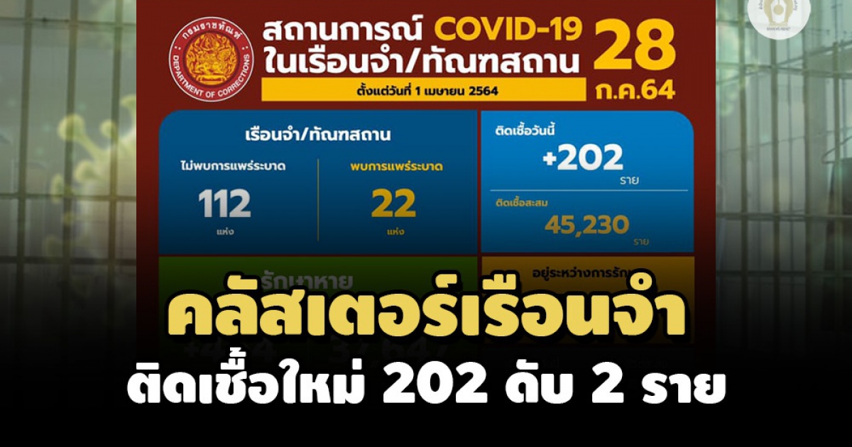 ผู้ต้องขังติดเชื้อใหม่ 202 ราย รักษาหายเพิ่ม 464 ราย เสียชีวิต 2 ราย ราชทัณฑ์เผยไม่พบเรือนจำแพร่ระบาดเพิ่ม ด้านที่ประชุม ศบค.ยธ.เน้นย้ำเจ้าหน้าที่ตรวจเชื้อ-ยืนยันผลลบทุกครั้งก่อนเข้าเรือนจำ พร้อมเตรียมแผนเข้มก่อนปล่อยตัว ไม่ให้นำเชื้อระบาดภายนอก