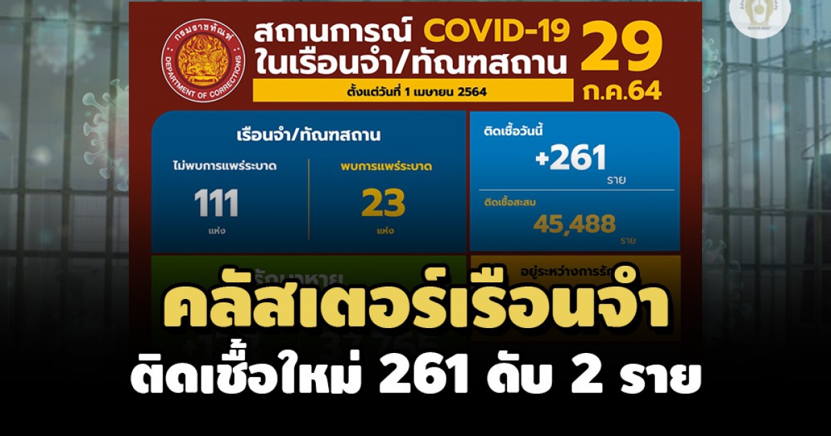 คลัสเตอร์เรือนจำติดเชื้อใหม่ 261 ราย รักษาหายเพิ่ม 122 ราย เสียชีวิต 2 ราย ราชทัณฑ์เผยผู้ต้องขังทุกรายต้องได้รับการตรวจหาเชื้อ-แยกกักตัว 14 วันก่อนปล่อยตัว กันแพร่เชื้อสู่ภายนอก