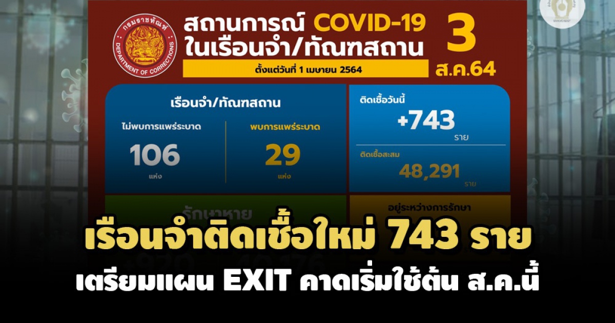 ผู้ต้องขังติดเชื้อใหม่ 743 ราย รักษาหายอีก 902 ราย เสียชีวิต 2 ราย ไม่พบเรือนจำระบาดเพิ่มต่อเนื่องเป็นวันที่ 2 พร้อมเตรียมแผน EXIT เรือนจำรวม 12 แห่ง คาดเริ่มทยอยใช้ต้น ส.ค.นี้