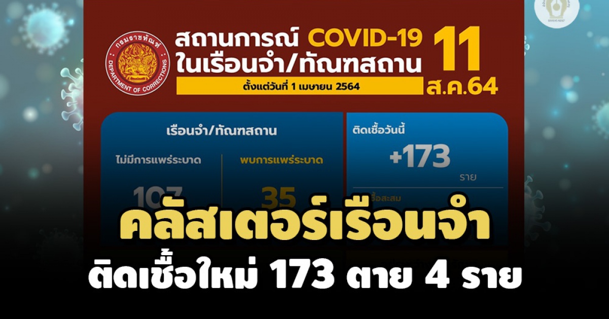 ผู้ต้องขังติดเชื้อใหม่ 173 ราย รักษาหายอีก 701 ราย เสียชีวิต 4 ราย กรมราชทัณฑ์เผยไม่พบการระบาดเพิ่ม และเตรียม EXIT เรือนจำอีก 5 แห่งในเดือน ส.ค.นี้ พร้อมกำชับทุกฝ่ายเฝ้าระวังสถานการณ์ และเตรียมแผนอย่างเป็นระบบ