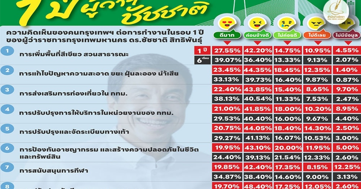นิด้าโพลเผยผลสำรวจความพอใจของประชาชนในกรุงเทพมหานครต่อการทำงานผู้ว่า 'ชัชชาติ สิทธิพันธุ์' ในรอบ 1 ปี 47.45% 'ค่อนข้างพอใจ' พอใจที่สุดในในเรื่องการเพิ่มพื้นที่สีเขียว รองลงมาเป็นการแก้ไขปัญหาความสะอาด ขยะ ฝุ่นละออง น้ำเสีย