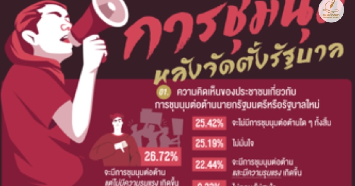 นิด้าโพลเผยผลสำรจความเห็นประชาชน 'การชุมนุมหลังจัดตั้งรัฐบาล' 57.71% เบื่อมากกับการชุมนุมต่อต้านรัฐบาล 38.63% ยอมรับอย่างเต็มใจหากรัฐบาลใหม่-นายกรัฐมนตรีไม่ได้มาจากพรรคที่เลือก