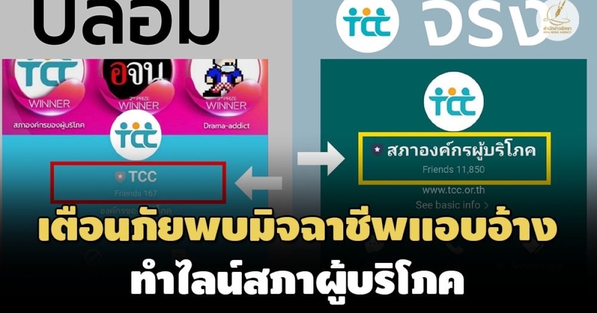สภาผู้บริโภคแจ้งเตือน กรณีพบมิจฉาชีพแอบอ้างสภาผู้บริโภค ทำไลน์ออฟฟิเชียลปลอมหลอกลวงผู้บริโภค โดยไลน์ออฟฟิเชียลสภาผู้บริโภคต้องเป็น @tccthailand เท่านั้น