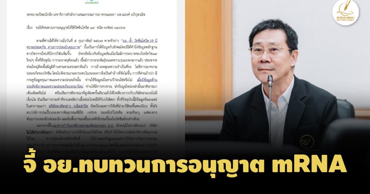 กลุ่มคนไทยพิทักษ์สิทธิ์ ส่งจดหมายเปิดผนึก จี้ทบทวนการอนุญาตวัคซีนโควิด mRNA ด้าน อย.ย้ำปลอดภัย ผ่านการประเมินคุณภาพ มีการติดตามประเมินความเสี่ยงอย่างใกล้ชิด