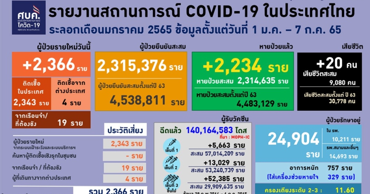 สำนักข่าวอิศรา (www.isranews.org) รายงานว่า เมื่อวันที่ 7 ก.ค. 2565 ศูนย์บริหารสถาการณ์โควิด-19 (ศบค.) รายงานสถานการณ์ประจำวัน โดยพบผู้ป่วยรายใหม่ 2,366 ราย จำแนกเป็น ติดเชื้อในประเทศ 2,362 ราย เกิดจากระบบเฝ้าระวังและระบบบริการฯ 2,343 ราย ติดเชื้อภายในเรือนจำ 19 ราย อีก 4 รายเดินทางมาจากต่างประเทศ รวมผู้ป่วยสะสม 4,538,811 ราย
