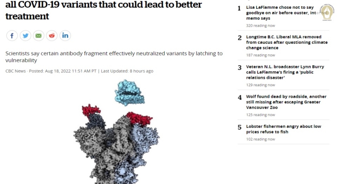 นักวิจัยแคนาดาประกาศพบจุดอ่อนในไวรัสโควิดทุกสายพันธุ์เป็นส่วนประกอบบนโปรตีนหนาม คาดมีผลออกแบบแอนติบอดีสามารถรับมือการกลายพันธุ์ในอนาคตได้