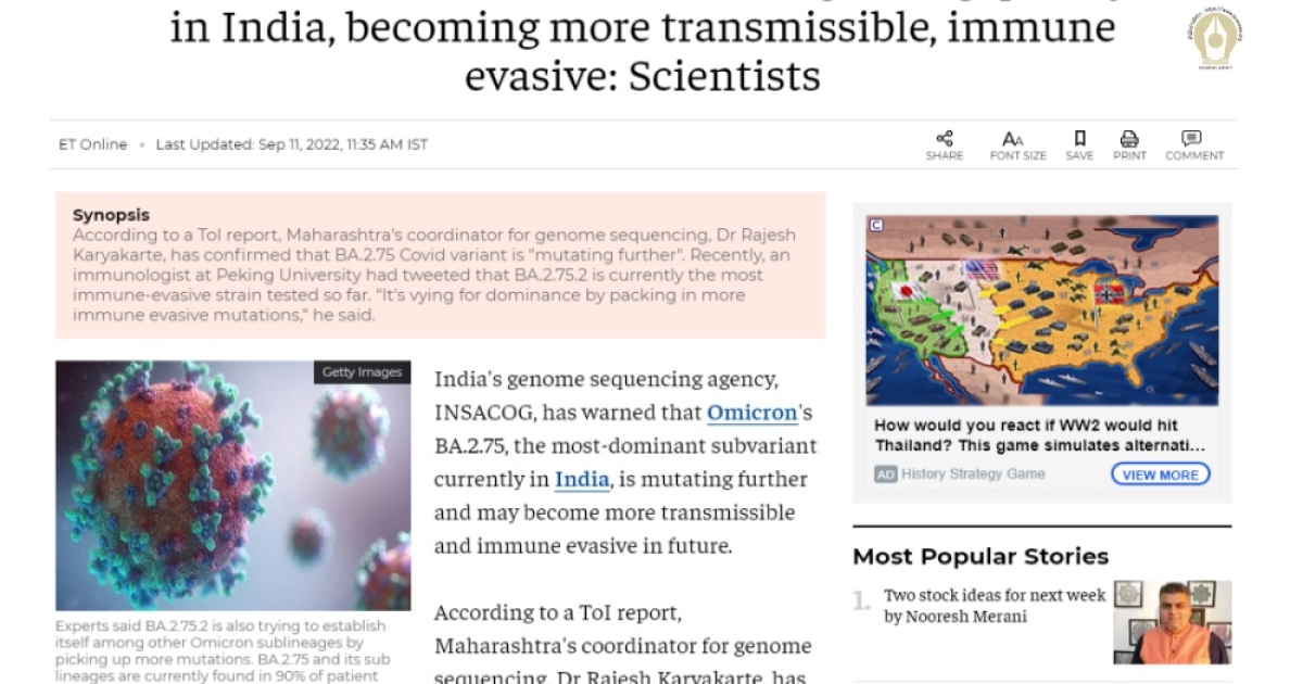 สำนักข่าวอิศรา (www.isranews.org) รายงานข่าวเกี่ยวกับสถานการณ์การระบาดของไวรัสโควิด-19หรือโคโรนาไวรัสว่า ที่ประเทศอินเดีย หน่วยงานจัดลำดับทางพันธุกรรมของประเทศหรือที่เรียกกันว่า INSACOG ได้มีการออกประกาศเตือนว่าโควิดโอไมครอนสายพันธุ์ย่อย BA.2.75 ซึ่งเป็นโควิดโอไมครอนสายพันธุ์ย่อยที่ระบาดหนักที่สุดในอินเดียนั้นได้กลายพันธุ์และอาจจะมีศักยภาพในการหลบหลีกภูมิคุ้มกันได้ดีขึ้นไปอีกในอนาคต