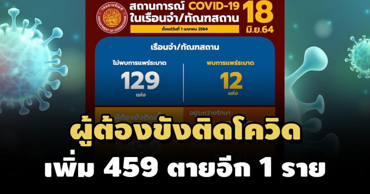 กรมราชทัณฑ์เผยผู้ต้องขังติดเชื้อรายใหม่ 459 ราย รักษาหายเพิ่ม 86 ราย และเสียชีวิตอีก 1 ราย แจงภาพรวมสถานการณ์ดีขึ้นพื้นที่การระบาดอยู่ในวงจำกัด มาตรการแยกกักโรคยังได้ผลดี