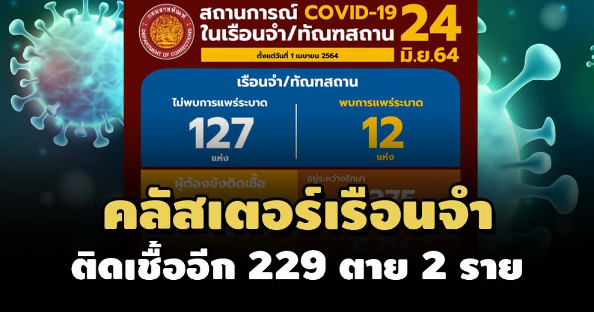 ผู้สื่อข่าวรายงานว่า เมื่อวันที่ 24 มิ.ย. 2564 นายอายุตม์ สินธพพันธุ์ อธิบดีกรมราชทัณฑ์ เปิดเผยสถานการณ์โควิดในเรือนจำและทัณฑสถานว่า มีผู้ต้องขังติดเชื้อรายใหม่ 229 ราย รักษาหายวันนี้ 157 ราย เสียชีวิต 2 ราย ทำให้มีผู้ต้องขังติดเชื้อที่ยังอยู่ในการดูแลของกรมราชทัณฑ์ 5,375 ราย