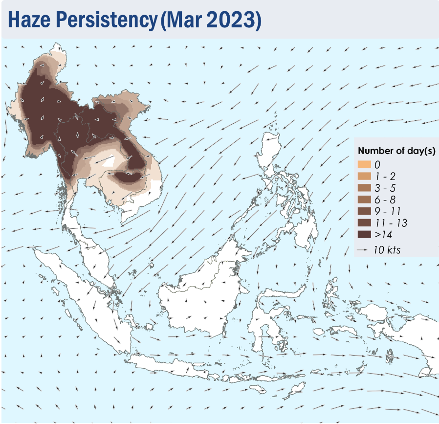 ภาพแผนที่จากดาวเทียมแสดงระยะเวลาการคงอยู่ของฝุ่นพิษ เดือนมีนาคม 2566