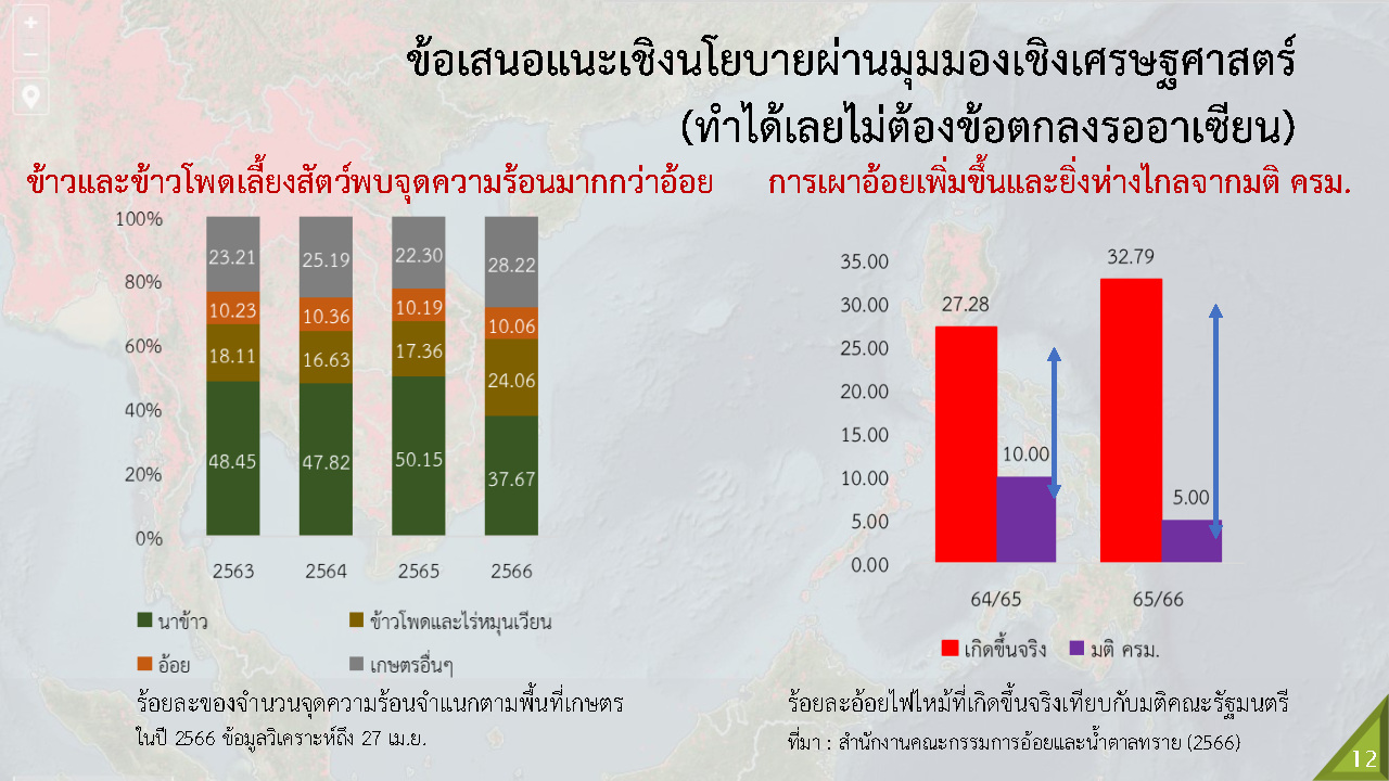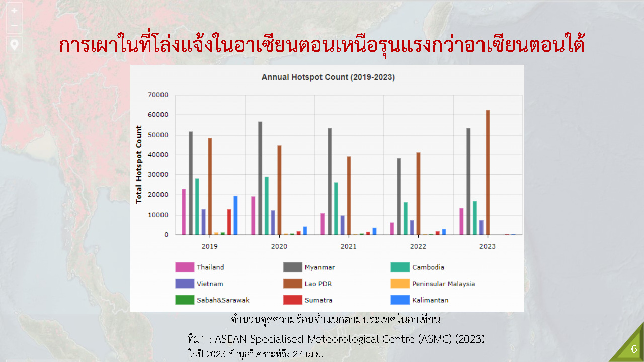 ถ้าเปรียบเทียบ ‘สถิติการเผาในที่โล่งแจ้งในอาเซียนรายประเทศตั้งแต่ปี 2562–2566’ ปรากฏพบการเผาที่โล่งมากที่สุดคือ สปป.ลาว เมียนมา และกัมพูชา ส่วนประเทศไทยอยู่ที่ 10 แต่ว่าอินโดนีเซียปีนี้ลดการเผาลงค่อนข้างมาก ดังนั้น จะเห็นได้ว่ามลพิษจากการเผาที่โล่งแจ้งในอาเซียนตอนเหนือมักรุนแรงกว่าอาเซียนตอนล่าง