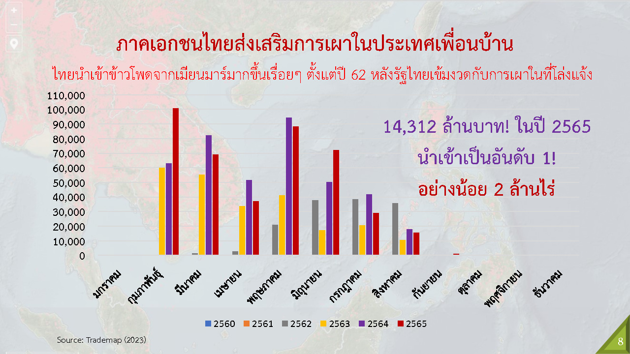 “ประเทศไทยเกี่ยวข้องทั้งในฐานะผู้ก่อมลพิษและผู้รับซื้อเช่นเดียวกัน โดยประเทศไทยนำเข้าข้าวโพดจำนวน 14,312 ล้านบาทในปี 2565 ทั้งนี้ ข้อมูลจากองค์การอาหารและเกษตรแห่งสหประชาชาติ (FAO) พบว่ามีพื้นที่อย่างน้อย 2 ล้านไร่ที่ประเทศไทยมีส่วนสนับสนุนทำให้เกิดการเผาในเมียนมา ในส่วนการส่งออกก็พบว่าประเทศไทยส่งออกเมล็ดพันธุ์ให้เมียนมาเป็นอันดับสองรองจากอินเดียและเพิ่มขึ้นเรื่อย ๆ พูดง่ายๆ เรามีส่วนเกี่ยวข้องตลอดห่วงโซ่อุปทานที่ทำให้เกิดการเผาเช่นกัน” รศ.ดร.วิษณุ ระบุ
