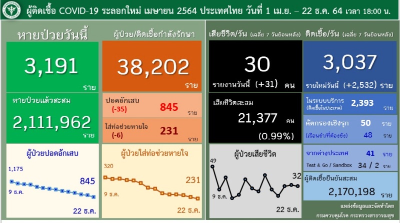 สำนักข่าวอิศรา (www.isranews.org) เมื่อวันที่ 22 ธ.ค. 2564 พญ.สุมนี วัชรสินธุ์ ผู้อำนวยการสำนักสื่อสารความเสี่ยงและพัฒนาพฤติกรรมสุขภาพ กรมควบคุมโรค ในฐานะผู้ช่วยรองโฆษกศูนย์บริหารสถาการณ์โควิด-19 (ศบค.) รายงานสถานการณ์ประจำวัน โดยพบผู้ป่วยรายใหม่ 2,532 ราย จำแนกเป็น ติดเชื้อในประเทศ 2,491 ราย เกิดจากระบบเฝ้าระวังและระบบบริการฯ 2,393 ราย เกิดจากการค้นหาเชิงรุกและพบการติดเชื้อในชุมชน 50 ราย ติดเชื้อภายในเรือนจำ 48 ราย อีก 41 รายเดินทางกลับมาจากต่างประเทศ รวมผู้ป่วยสะสม 2,199,061 ราย