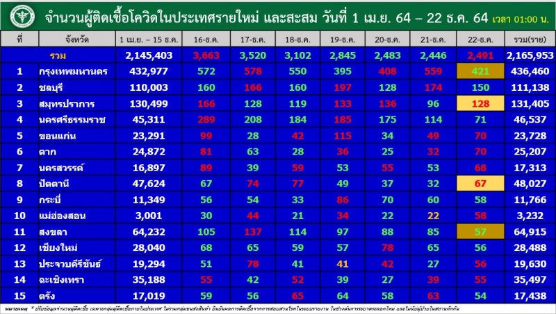 อนึ่งเมื่อเวลา 08.29 น. สำนักข่าวอิศรา รายงานสถานการณ์การแพร่ระบาดเชื้อไวรัสโควิด-19 ประเทศไทย ประจำวันที่ 22 ธันวาคม 2564 ว่า มีผู้ติดเชื้อรายใหม่ 2,532 ราย