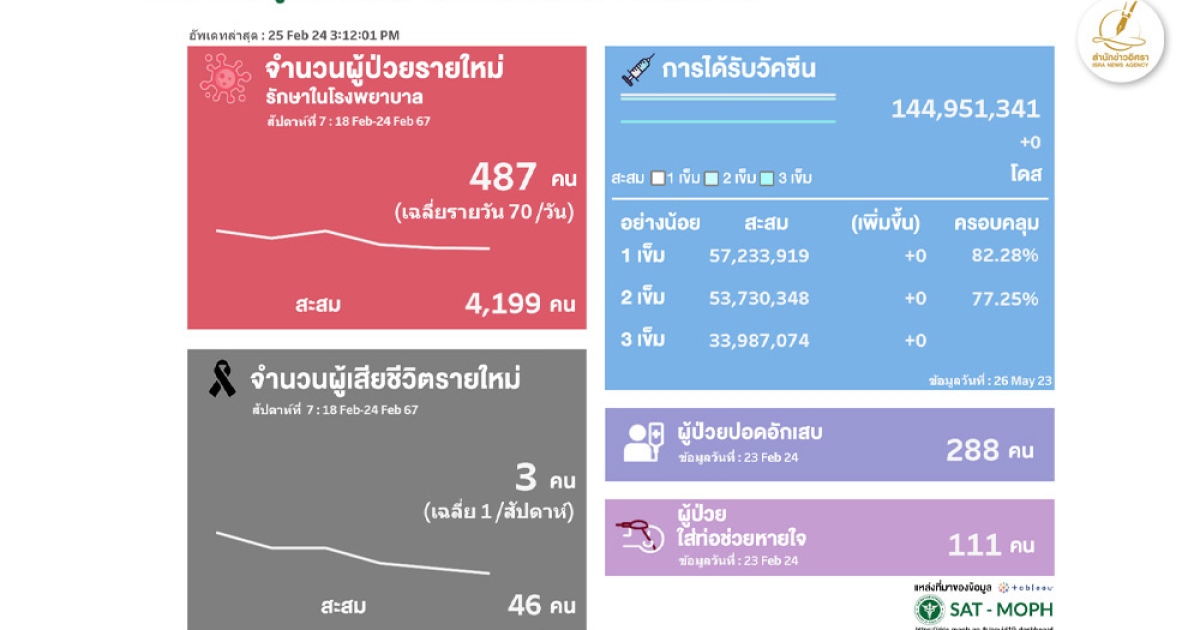 สำนักข่าวอิศรา (www.isranews.org) รายงานสถานการณ์แพร่ระบาดของโรคโควิด-19 ประเทศไทย ประจำสัปดาห์ ระหว่างวันที่ 18 - 24 ก.พ. 2567 มีจำนวนผู้ติดเชื้อใหม่เข้ารักษาตัวโรงพยาบาล 487 ราย เฉลี่ยวันละ 70 ราย ทำให้จำนวนผู้ติดเชื้อสะสมอยู่ที่ 4,199 ราย (ตั้งแต่ 1 ม.ค. 2567)