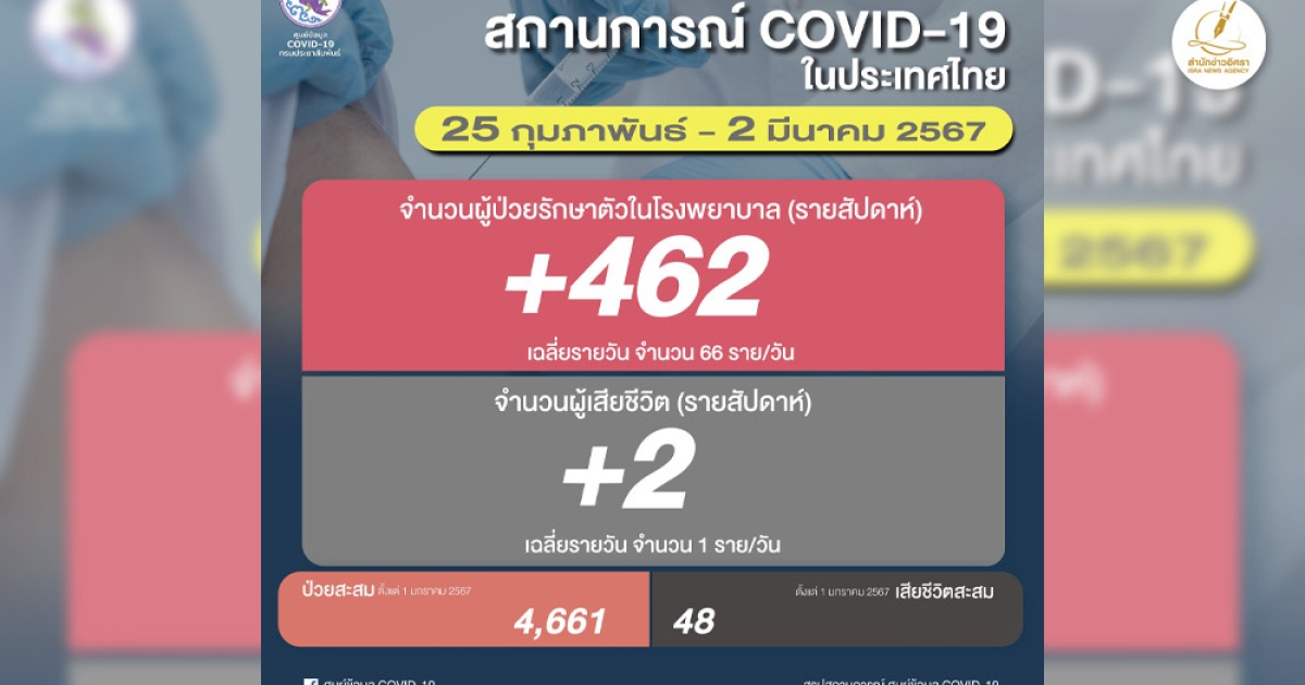 สถานการณ์โควิดไทย สัปดาห์ล่าสุด 25 ก.พ. - 2 มี.ค. 2567 ติดเชื้อเข้ารักษาใน รพ.ใหม่ 462 ราย เฉลี่ย 66/วัน เสียชีวิต 2 ราย