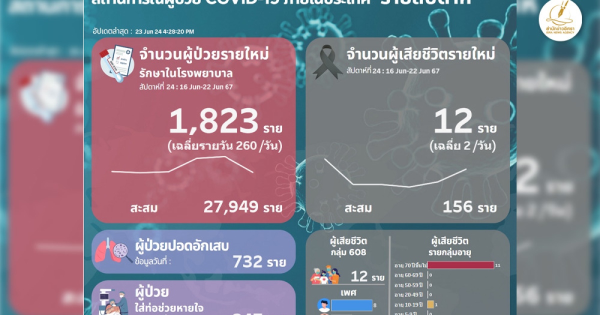 สถานการณ์โควิดไทย สัปดาห์ล่าสุด 16 - 22 มิ.ย. 2567 ติดเชื้อเข้ารักษาใน รพ.ใหม่ 1,823ราย เฉลี่ย 260/วัน เสียชีวิต 2 ราย อาการหนัก 732 ราย