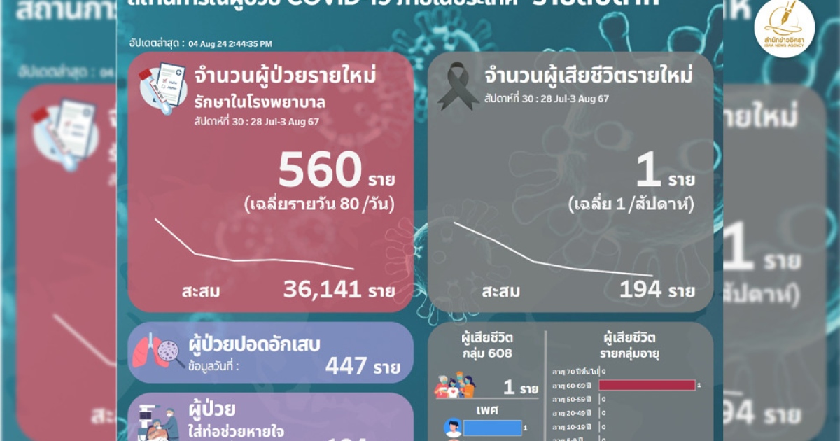 สำนักข่าวอิศรา (www.isranews.org) รายงานสถานการณ์แพร่ระบาดของโรคโควิด-19 ประเทศไทย ประจำสัปดาห์ ระหว่างวันที่ 28 ก.ค. - 3 ส.ค. 2567 มีจำนวนผู้ติดเชื้อใหม่เข้ารักษาตัวโรงพยาบาล 560 ราย เฉลี่ยวันละ 80 ราย ทำให้จำนวนผู้ติดเชื้อสะสมอยู่ที่ 36,141 ราย (ตั้งแต่ 1 ม.ค. 2567)