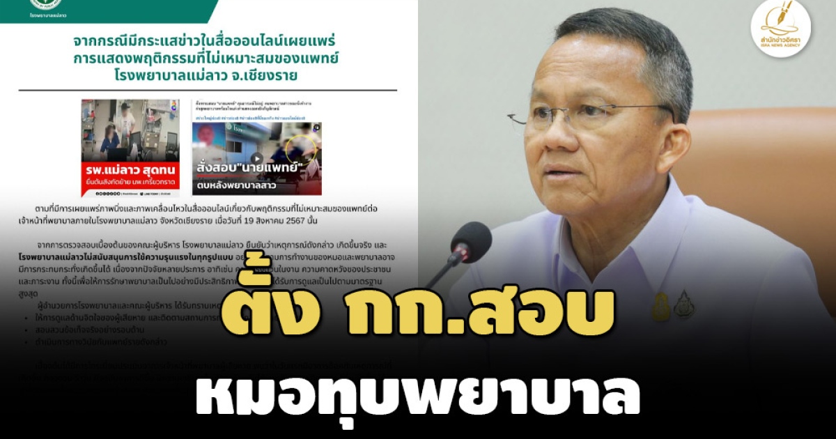 'สมศักดิ์'สั่งตั้งกรรมการสอบสวน 90 วัน กรณีหมอทำร้ายพยาบาล พร้อมย้ายหมอไปรพ.เชียงราย ชี้ เป็นการสื่อสารคาดเคลื่อน ทำเกิดอารมณ์ชั่ววูบ ด้านผู้บริหาร รพ.แม่ลาวเผยสาเหตุ 'เครียดภาระงานหนัก' ย้ำไม่สนับสนุนความรุนแรงทุกรูปแบบ พร้อดูแลเยียวยาผู้เสียหายใกล้ชิด