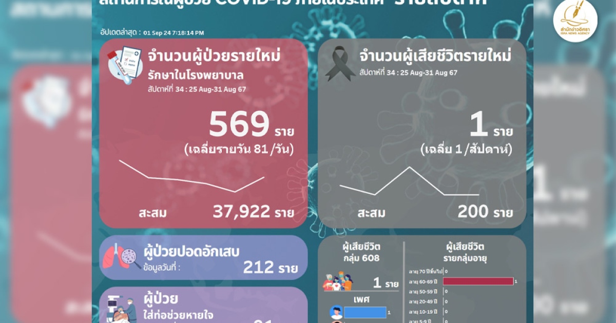 สถานการณ์โควิดไทย สัปดาห์ล่าสุด 25 - 31 ส.ค. 2567 ติดเชื้อเข้ารักษาใน รพ.ใหม่ 569 ราย เฉลี่ย 81/วัน เสียชีวิต 1 ราย อาการหนัก 212 ราย