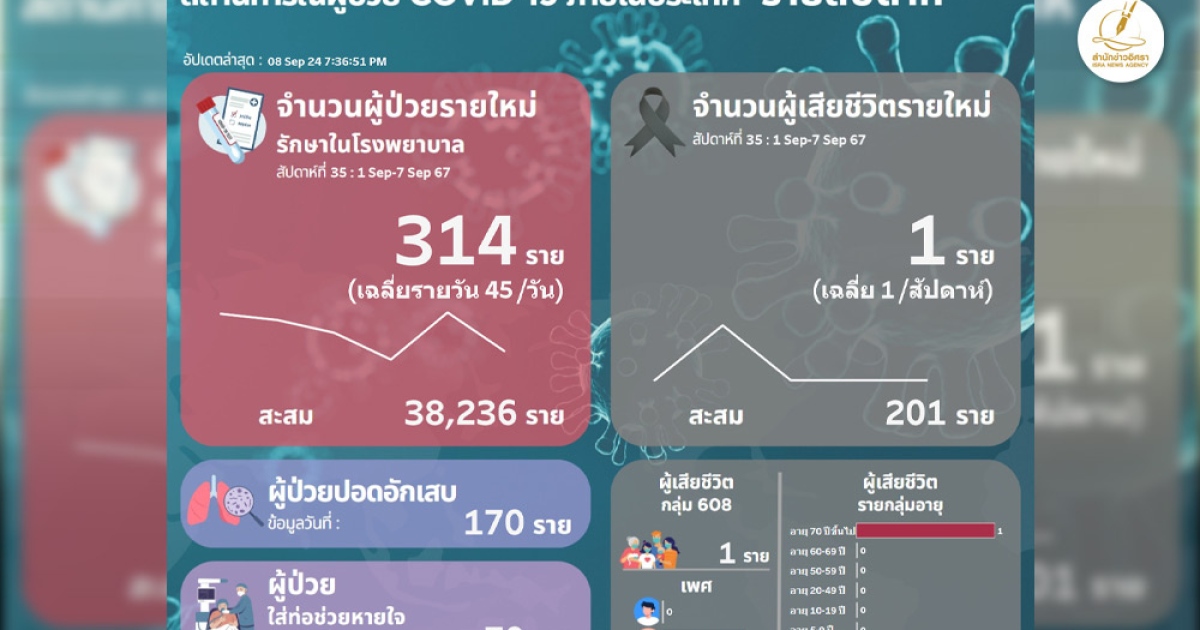 สถานการณ์โควิดไทย สัปดาห์ล่าสุด 1 - 7 กันยายน 2567 ติดเชื้อเข้ารักษาใน รพ.ใหม่ 314 ราย เฉลี่ย 45/วัน เสียชีวิต 1 ราย อาการหนัก 170 ราย
