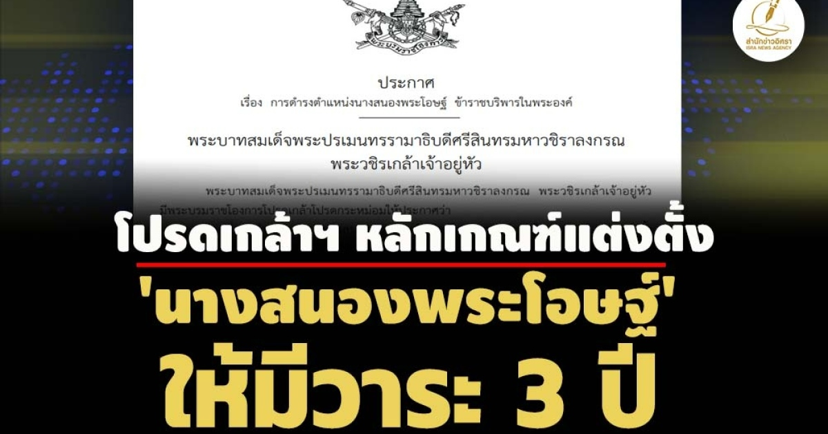 สำนักข่าวอิศรา (www.isranews.org) รายงานว่า เมื่อวันที่ 16 พ.ย.2567 ราชกิจจานุเบกษา เผยแพร่ประกาศเรื่อง การดำรงตำแหน่งนางสนองพระโอษฐ์ ข้าราชบริพารในพระองค์