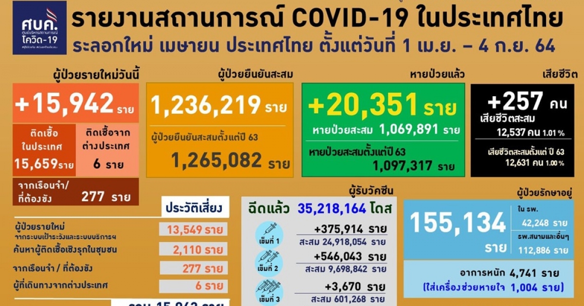 สำนักข่าวอิศรา (www.isranews.org) รายงานว่า เมื่อวันที่ 4 ก.ย. 2564 ศูนย์บริหารสถานการณ์โควิด (ศบค.) เผยแพร่สถานการณ์โควิดประจำวัน โดยพบผู้ติดป่วยรายใหม่ 15,942 ราย แบ่งเป็นการติดเชื้อในประเทศ 15,659 ราย เกิดจากระบบเฝ้าระวังและระบบบริการฯ 13,549 ราย เกิดจากการค้นหาเชิงรุกและพบการติดเชื้อในชุมชน 2,110 ราย ติดเชื้อภายในเรือนจำ 277 ราย และอีก 6 รายเดินทางกลับมาจากต่างประเทศ รวมผู้ป่วยสะสม 1,265,082 ราย หายป่วยเพิ่ม 20,351 ราย อยู่ระหว่างรักษาตัวในโรงพยาบาล 155,134 ราย โดยในจำนวนนี้มีอาการหนัก 4,741 ราย และใส่ท่อช่วยหายใจ 1,004 ราย เสียชีวิตเพิ่ม 257 ราย รวมเสียชีวิตสะสม 12,631 ราย