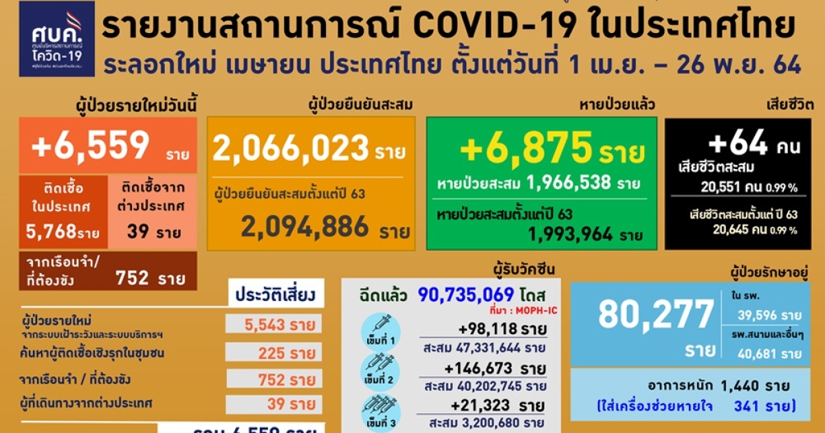 อนึ่งก่อนหน้านี้ เวลา 07.13 น. สำนักข่าวอิศรา รายงานสถานการณ์การแพร่ระบาดเชื้อไวรัสโควิดประเทศไทย ประจำวันที่ 26 พ.ย.2564 ว่า มีผู้ติดเชื้อรายใหม่ 6,559 ราย ทำให้ยอดรวมผู้ติดเชื้อสะสมอยู่ที่ 2,066,023 ราย